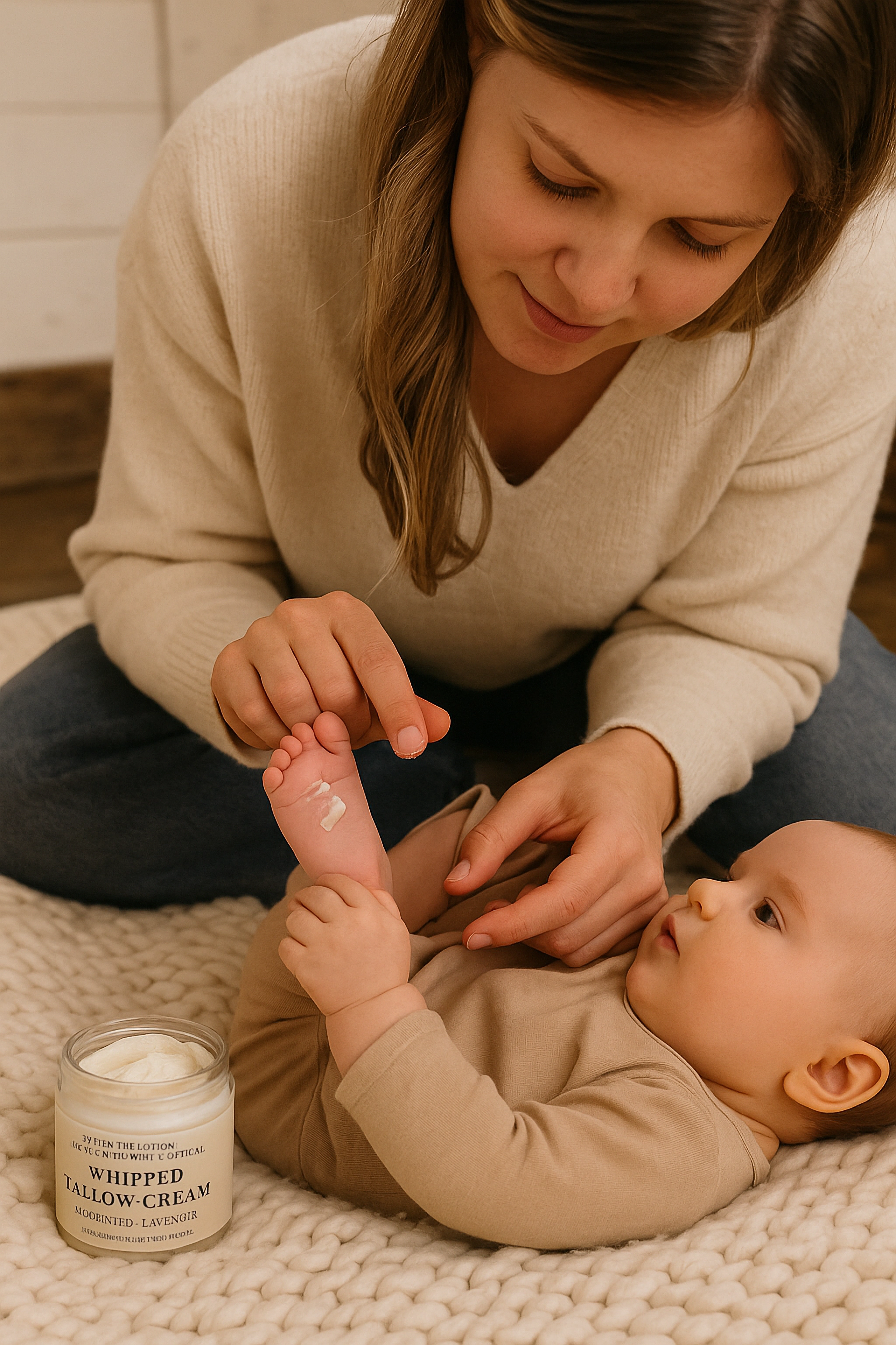 - Gentle Baby Care – Tallow balm is a lifesaver for babies’ delicate skin. We use an unscented, pure tallow balm as a diaper rash cream at the first sign of redness. It creates a protective barrier and soothes irritation overnight. Unlike store-bought creams that can contain harsh ingredients, tallow is completely natural and safe for our little ones. I also massage a tiny dab into any dry patches on my youngest’s arms and legs before bed! Knowing it’s just pure grass-fed tallow and nothing artificial gives me peace of mind.